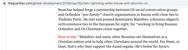 - “forged a partnership between US social conservative groups and Orthodox ‘pro-family’ church organisations in Russia with close ties to Vladimir Putin”;