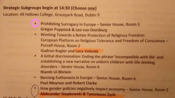 A year later, in Dublin, Agenda Europe was joined by the Ordo Iuris foundation, to be precise, by its then president, Aleksander Stępkowski (currently a Polsih Supreme Court judge). He was accompanied by Ordo Iuris’s current vice president, Tymoteusz Zych. Among the participants, was someone also well known to us, Grégor Puppinck from ECLJ.