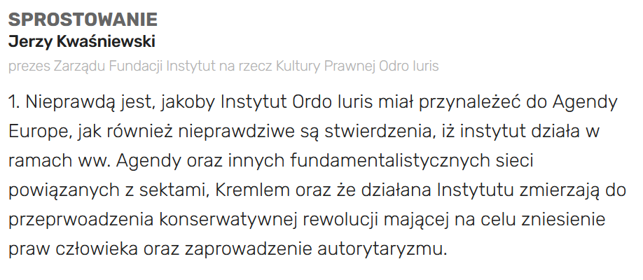 [The “rectification” above reads: “It is false that the Ordo Iuris Institute is a member of Agenda Europe, and it is false that the institute works within the Agenda and other fundamentalist networks tied to sects and the Kremlin, and that the institute’s activities are leading to a conservative revolution, aimed at abolishing human rights and imposing authoritarianism.”]