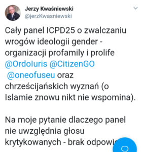 [The tweet above reads: “The whole panel of ICPD25 about fighting the enemies of gender ideology – pro-family and pro-life organizations @OrdoIuris @CitizenGo @oneofuseu and the Christian religion (again, no one mentions Islam). To my question why the panel excludes voices of those criticized – no answer.”]