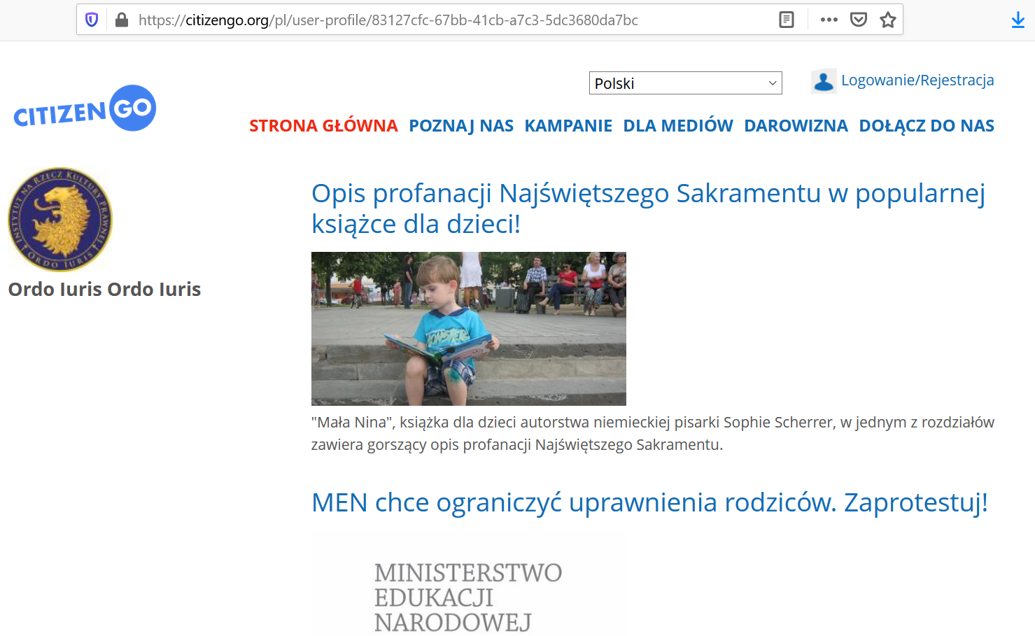 Ordo Iuris eagerly utilizes the CitizenGo petition platform, as seen here: . On the scan below is the start of the list of numerous petitions Ordo Iuris has introduced with the help of CitizenGo. Currently, this number is up to 13.