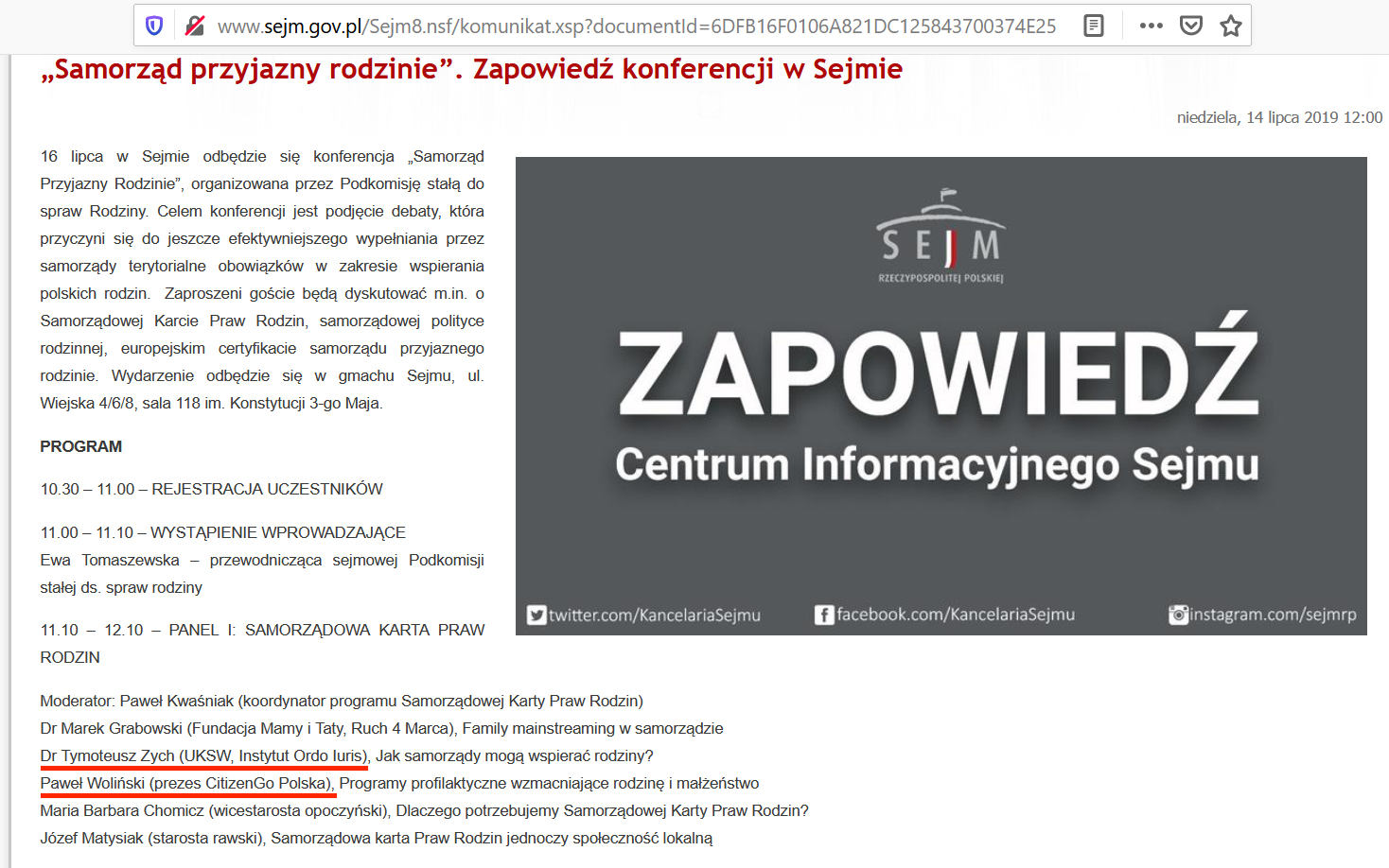 Ordo Iuris and CitizenGo also appear together at conferences. Below is the announcement for a 2019 conference in the Sejm.