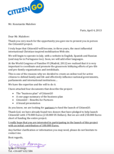 Less than a month later, a description of the project named CitizenGo was sent by Arsuaga, not to Komov, but to his boss, the Kremlin oligarch Malofeev. In this letter, it is mentioned that the two men have met. The Spaniard, Arsuaga, proposes that the Kremlin Russian, Malofeev, help finance the CitizenGo project. He requests 100,000 euros.