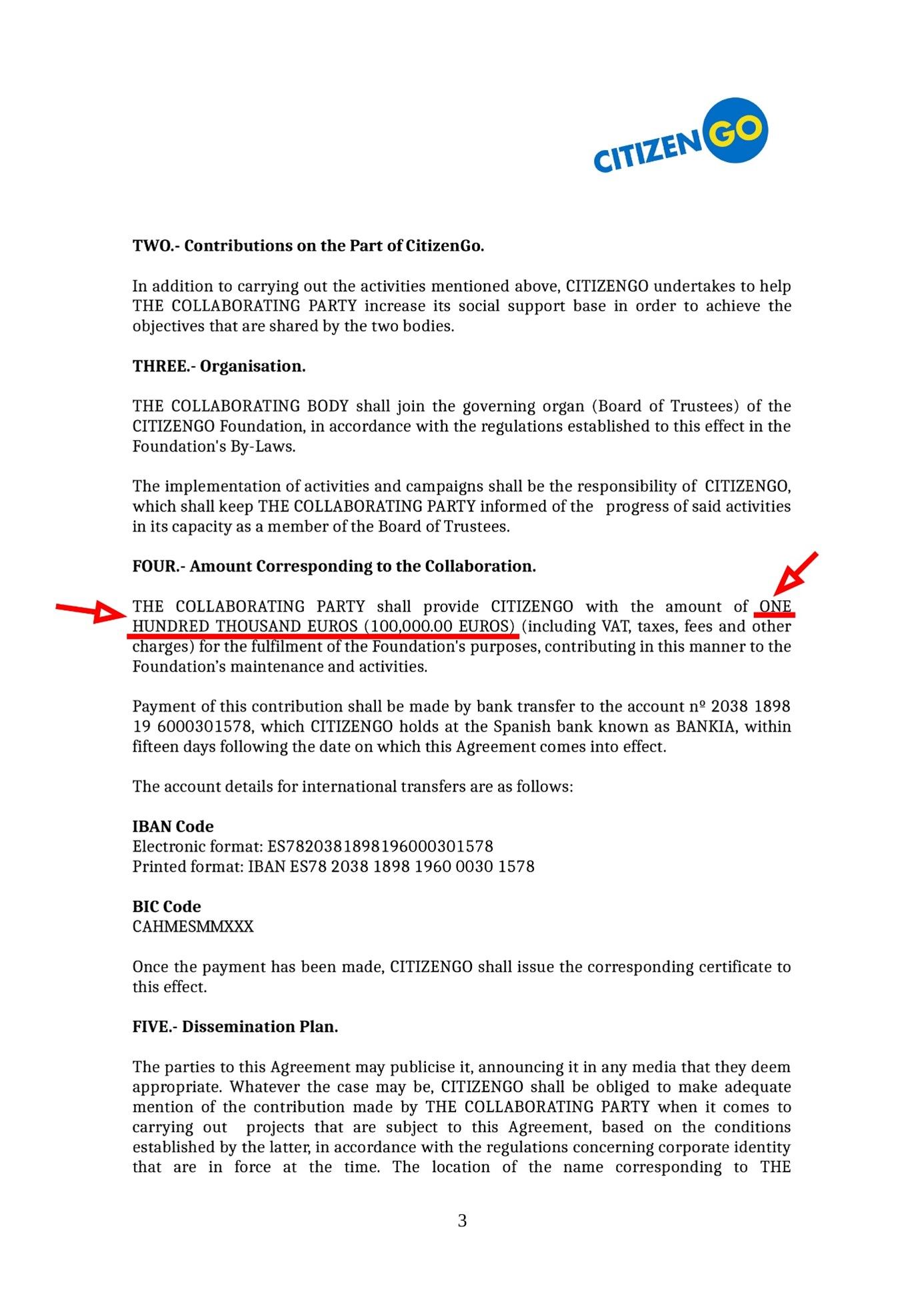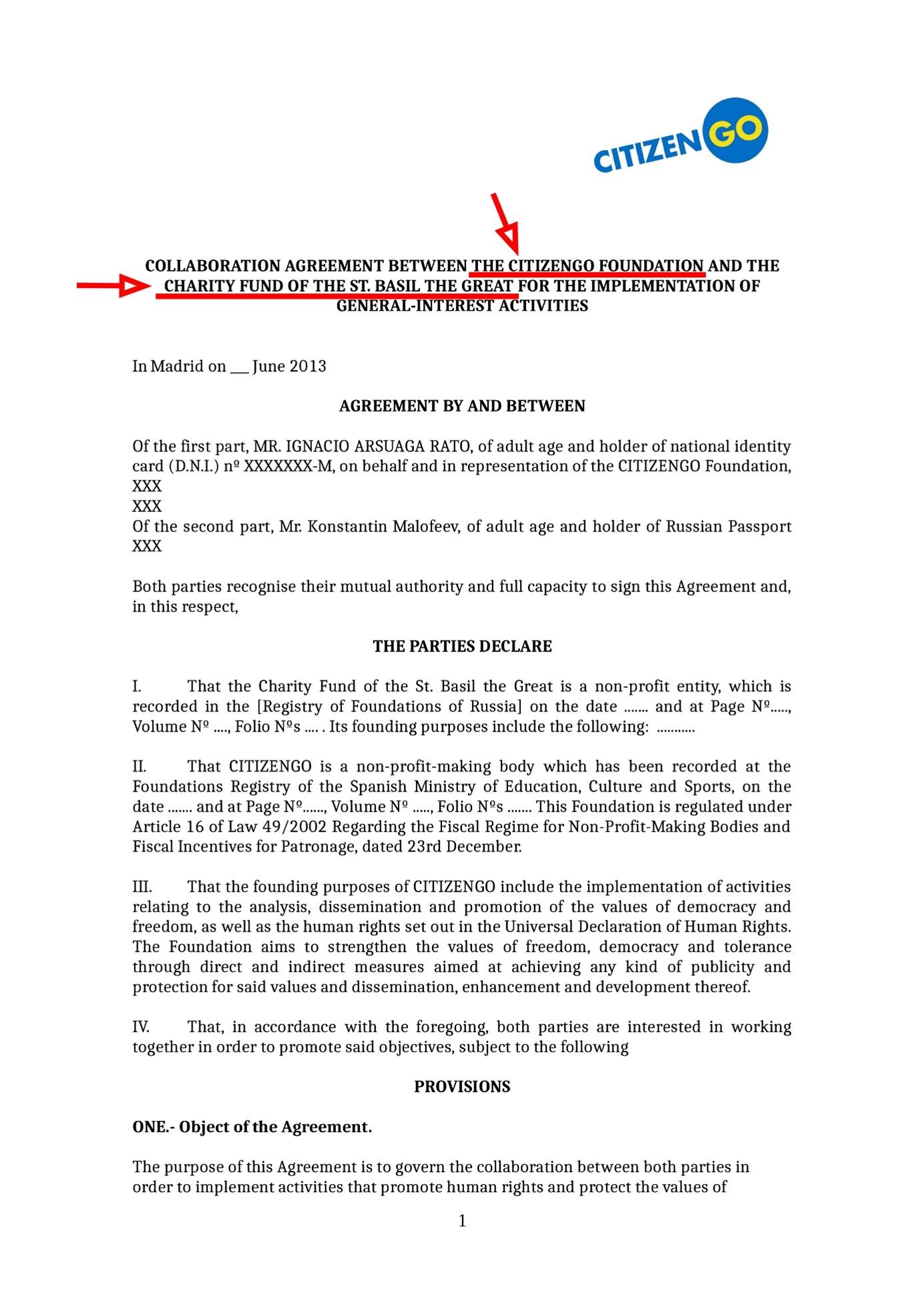 The sum of €100,000 was to go towards CitizenGo's activities “that promote human rights and protect the values of freedom, democracy and tolerance from the abuse and attacks to which they are subjected internationally, through the launch of a Web platform for online pro-life and pro-family campaigns of a global nature.” The agreement also states that CitizenGo will "assist" Malofeev's foundation in increasing „its social support base in order to achieve the objectives that are shared by the two bodies.” Moreover, the ability to influence CitizenGo was also secured, with the addition that Malofeev's foundation "shall join the governing organ (Board of Trustees) of the CITIZENGO Foundation.” This occurred precisely in the person of Komov, who became a member of the organization's board of directors after signing the agreement.