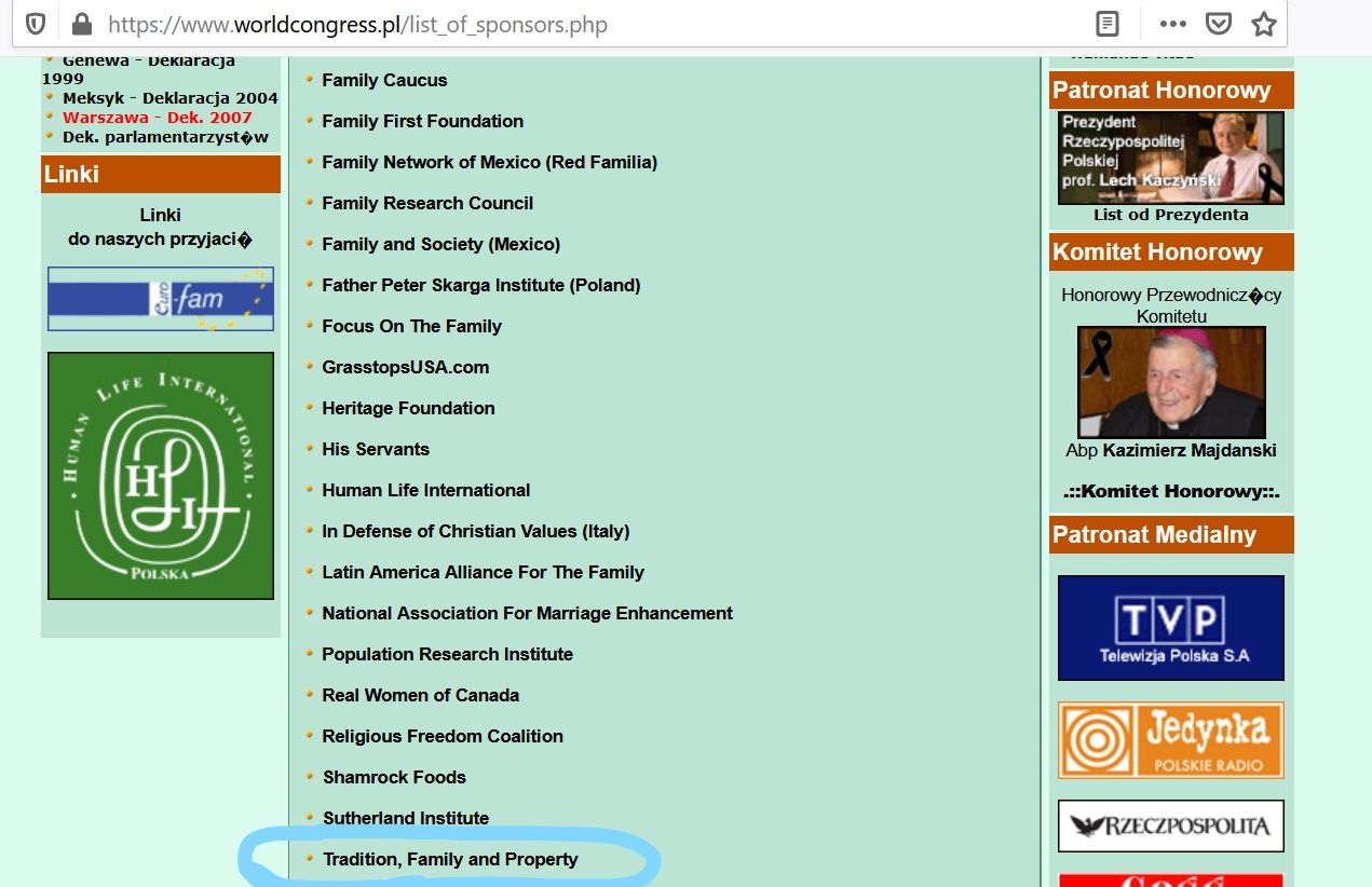 The institute sponsored the WCF’s Warsaw edition along with its mother organization, that is, with TFP (Tradicão, Família e Propiedade; Tradition, Family and Property) (scan 2 also showing the sponsors’ list).
