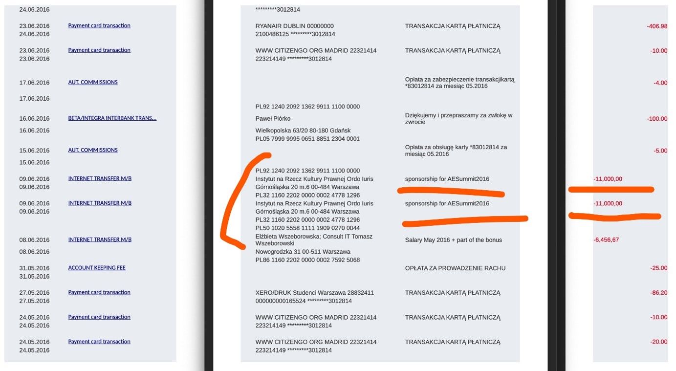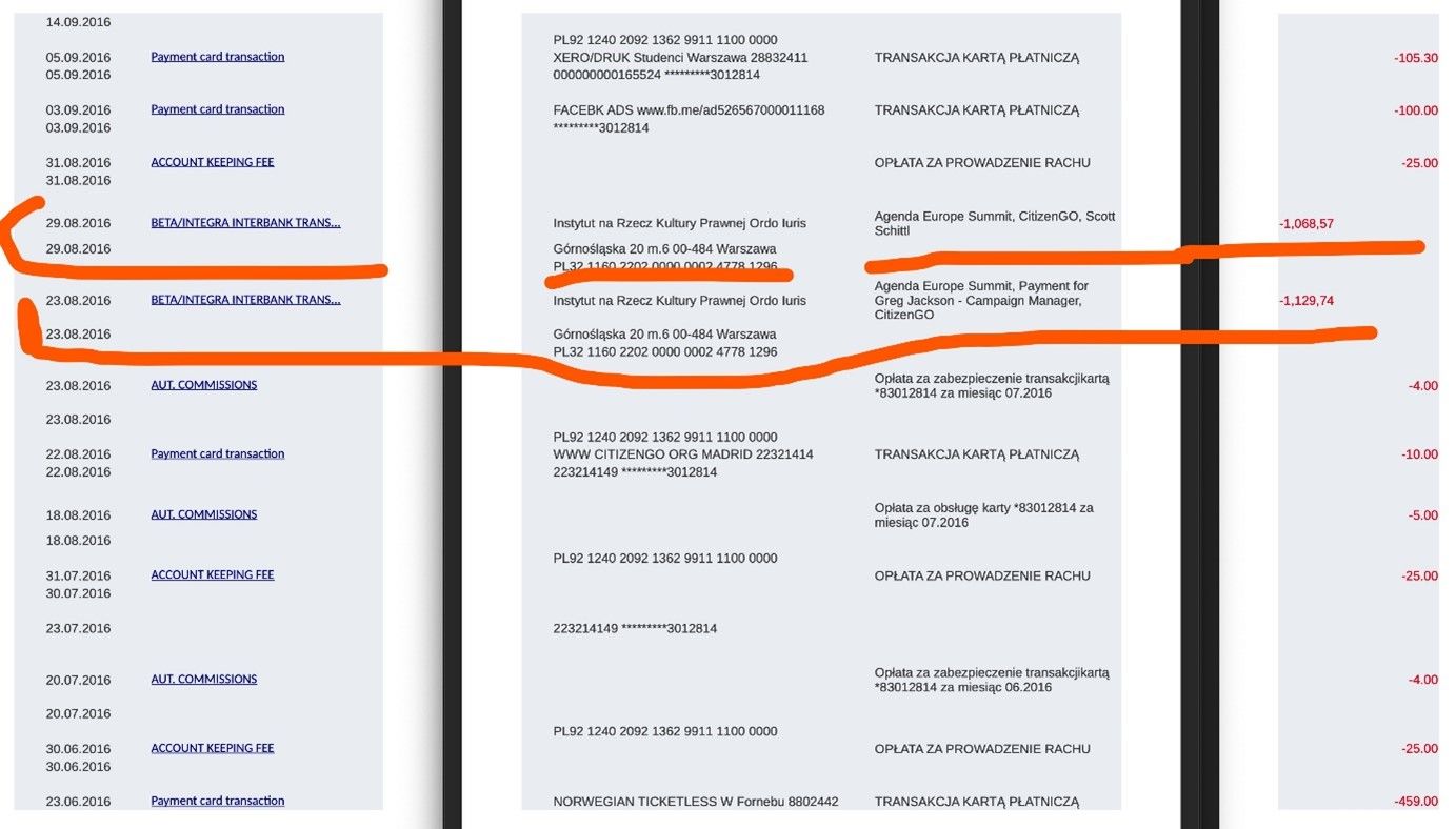 Ordo Iuris also received more than 2,000 PLN from this organization, probably as fees for two participants of the event. The sum comes from the bank statement of the Polish branch of the organization from a short period of January-October 2016, and may not be impressive, but it proves the financial ties between Ordo Iuris and CitizenGo.
