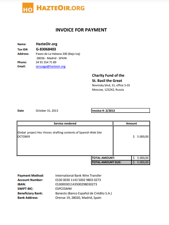 In a memo from March 23, 2013, published by Wikileaks, Arsuaga wrote about the possibility of getting 100,000 euros from Malofeev and Yakunin