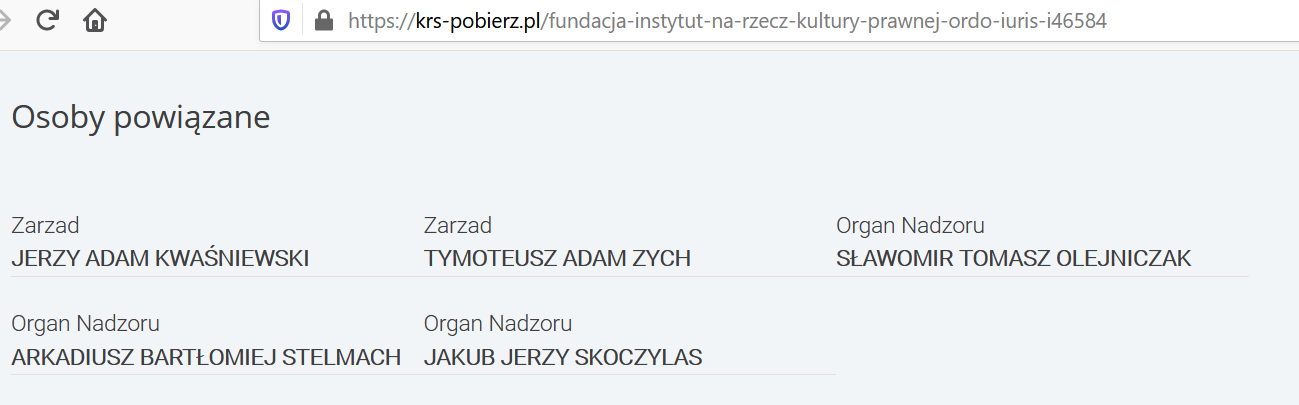 The Piotr Skarga Association president, Sławomir Olejniczak, was also a member of the supervisory body (the Council) of the Ordo Iuris foundation, until 2021. Other members of the Piotr Skarga Association, Arkadiusz Stelmach and Jakub Skoczylas, belonged to the Council of Ordo Iuris as well also until 2021, according to the National Court Register [Polish only].