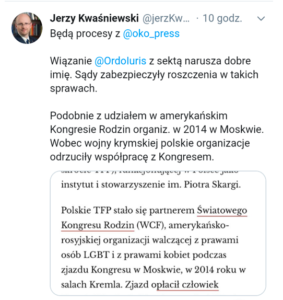 Mimo to prezes Ordo Iuris, Jerzy Kwaśniewski, protestuje przeciwko ujawnianiu prawdy. Twierdzi, że wiązanie fundacji Ordo Iuris ze Światowym Kongresem Rodzin narusza jej „dobre imię”.