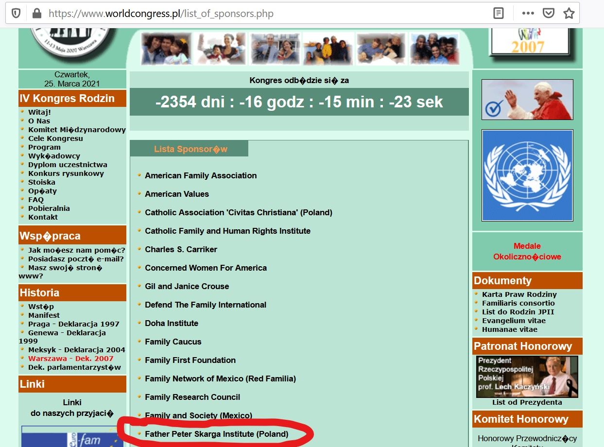 Przejdźmy dalej. Gdy Światowy Kongres Rodzin (World Congress of Families, WCF, forum radykalnych organizacji religijnych, prowadzone przez Amerykanów i Rosjan) odbył się w 2007 r. w Warszawie, Instytut im. Piotra Skargi wystąpił jako sponsor tej imprezy (skan nr 1, całość tutaj).