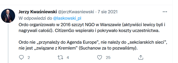 Najpierw zaskoczony prezes Ordo Iuris, Jerzy Kwaśniewski, na twitterze 7 sierpnia 2021 potwierdził przelew z CitizenGo, ale wciąż negował przynależność do Agendy Europe oraz związki z Kremlem.