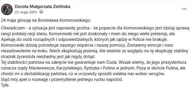 To mój apel sprzed 10 lat. Napisałam go kiedy wielu zwolenników i członków Twojego Ruchu (wcześniej Ruch Palikota) zadeklarowało publicznie, że oddadzą głos na Dudę, względnie nie pójdą do wyborów. Wszyscy wiemy, co się potem stało i jak wielki jest jego udział w niszczeniu praworządności i Państwa Polskiego.